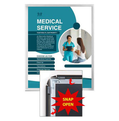 Mini poster snap frames with .60" wide mitered corners allow you to effortlessly place and change your posters, signs, and advertisments; all four sides of the .60" wide metal snap frames are spring-loaded to snap-open and snap shut.