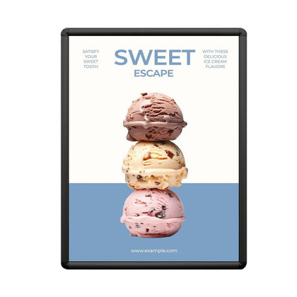 This quick-changing Radius Snap Frame is designed for thin poster inserts, and provides posters, photography and signs with a secure, tight and wrinkle free grip.