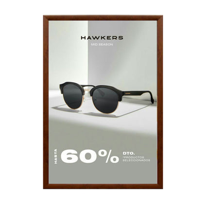 The wall mount wood poster display from SwingFrame features a classic wood picture frame style with a simple flat face that's 1 3/16" wide, the poster frame profile is unadorned, well proportioned and designed to compliment wide-ranging indoor environments where wood is an important design element to the interior decor.
