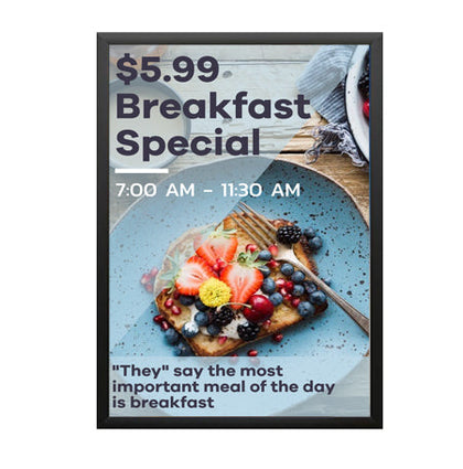Its simplicity and hidden features makes the wall mount Wide-Face SwingFrame Menu Frame display case a smart choice for any type of restaurant, with its simple, 1” slightly curved contemporary style metal frame profile, the Wide-Face is our most popular changeable restaurant menu display frame.
