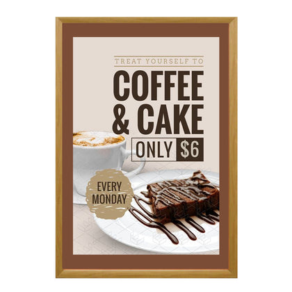 Cost effective, wall mount wood snap frames for small and large signage projects are accentuated with a simulated wood wrap finish and are the ideal choice for many quick change display applications that require an interior touch with a wood finish.