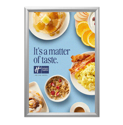 The Wide Face Poster SwingFrame has proven to be our most popular wall-mounted poster frame profile, with its simple, 1” slightly curved contemporary style metal frame designed for quick change functionality as well as its appealing presentation.