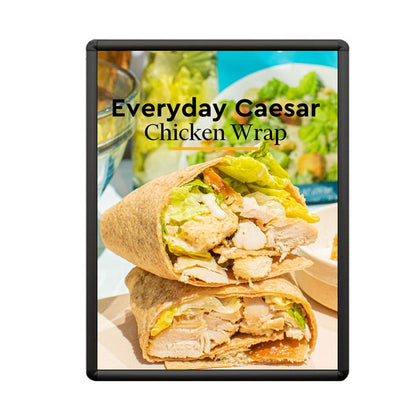 Its simplicity and hidden features makes the wall mount Wide-Face SwingFrame Menu Frame display case a smart choice for any type of restaurant, with its simple, 1” slightly curved contemporary style metal frame profile, the Wide-Face is our most popular changeable restaurant menu display frame.