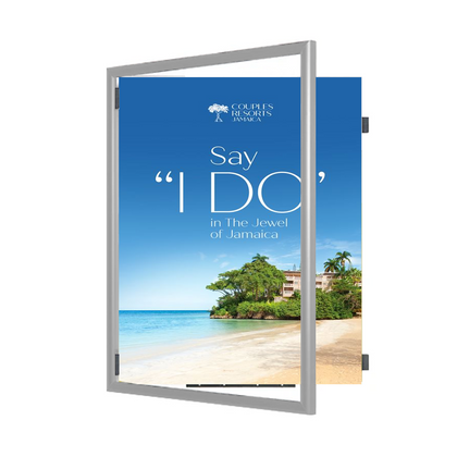 There's no other framing system like it. Our patented 36x72 poster frames, "SwingFrame" features hidden hinges and gravity lock. The beauty of the SwingFrame is that once it's wall mounted, you can't tell that it swings open. Just swing open. Place your 36x72 poster or other insert. Swing Close. Unlike permanent 36x72 picture frames, you don't have to dismantle the SwingFrame to update your marketing materials. thus making changing posters, other printed graphics and signage easy.