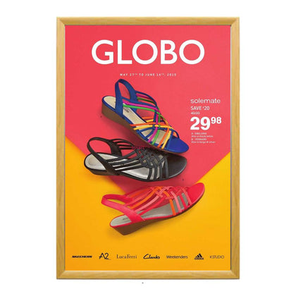 Whatever the application, these oversized, mitered, high quality, front-loading "SwingSnap" wood poster display frames make a popular poster display and sign holder, widely used for trade shows, exhibits, banks, and as store signage fixtures.