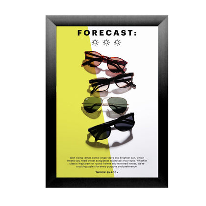 There's no other framing system like it. Our patented 48x48 poster frames, "SwingFrame" features hidden hinges and gravity lock. The beauty of the SwingFrame is that once it's wall mounted, you can't tell that it swings open. Just swing open. Place your 48x48 poster or other insert. Swing Close. Unlike permanent 48x48 picture frames, you don't have to dismantle the SwingFrame to update your marketing materials. thus making changing posters, other printed graphics and signage easy.