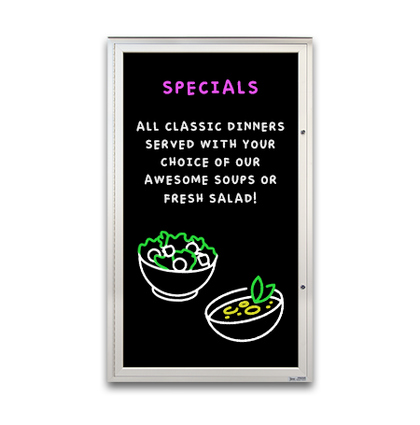 With over 15 standard sizes, these weatherproof metal exterior displays are ideal for outdoor cafes, delis, restaurant menus, service centers, building directories, events, and messaging boards for schools, libraries, and communities.