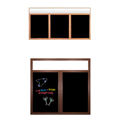 "SwingCase" Indoor Black Board with Header and LED Lights (2 or 3 Door) features a Gloss Black Magnetic Porcelain Steel Board that you can hand draw graphics or create messages with a variety of colorful, eye-catching, florescent markers included. Write on Wipe off your messages and announcements.