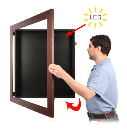 **Wide Wood Framed Shadow Boxes LED Lighted can be surface mounted or recessed. If you are planning to recess these boxes, please call us to confirm the overall outside back box dimensions. The flanged picture frame which is placed over the back box will also need some clearance for the door to swing-open 90 degrees.