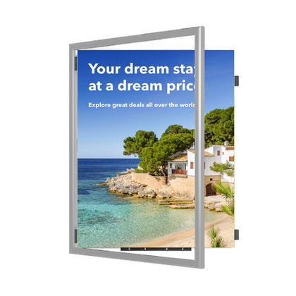SwingFrame 12 x 24 poster frame is made for quick poster changes. This unique framing system is designed with concealed hinges and gravity lock. Swing-Open the front wood frame door. Place or change your poster or sign. Swing shut. Once wall mounted, you can't tell that the 12x24 poster frame swings open.