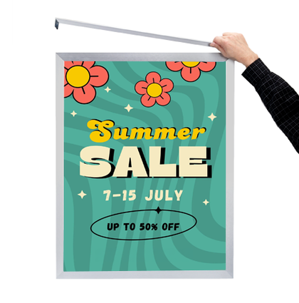 If ordering our patented SwingFrame Poster Display, Slide-In Poster Frame, SwingSnap Snap Open Poster Display, or SwingStand Floor Poster Displays we offer the benefit of shipping your poster in our frame at time of order. This will reduce shipping costs and tracking numbers for your order.