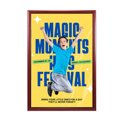 The 22x28 metal movie poster display is perfect for movie studios, cable TV stations, movie theatres, playhouses, retail stores, corporate offices, museums, hotels, casinos, recreational facilities, home theatres or any other indoor environment where an elegant changeable movie poster frame is needed.