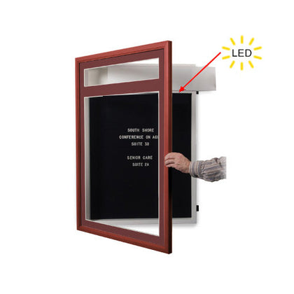 Our illuminated #353 SwingFrame Designer Wood Framed Letter Board, wall-mounted Indoor enclosed letter board has an interior LED light positioned to spotlight downward onto your message, menu, or directory for better clarity. The slim LED light is UL approved, long lasting, energy efficient, that's easily replaceable.
