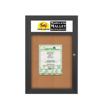 The Header on the Ultra Thin 36 x 36 Enclosed Cork Bulletin Board Display is a great way to grab attention for your Message, Menu, Map, Poster, Schedule, Permits, Photos or other posting.